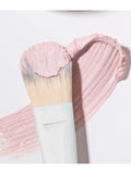 Vegan brush for face masks with white bristle head and silver ferrule on a pink background